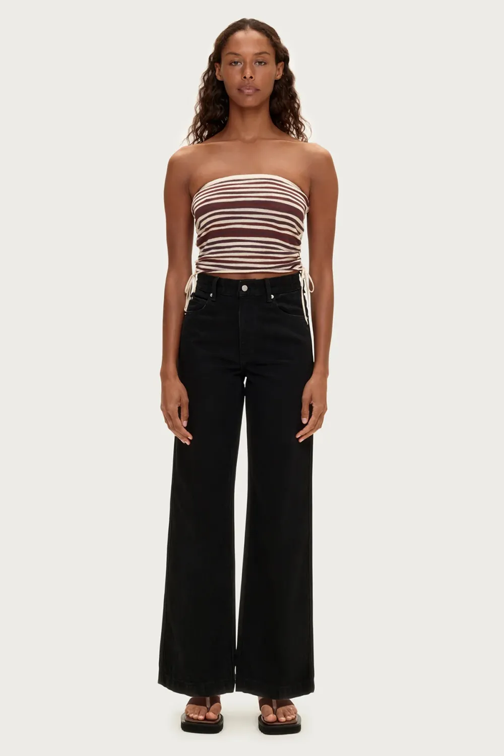 A gathered bandeau silhouette made from a soft ramie-cotton blend in a custom stripe pattern. Designed with a comfortable elasticated neckline, side seam channels, and adjustable self-tie drawcords. Style it cropped, ruched, or worn long for versatile looks.